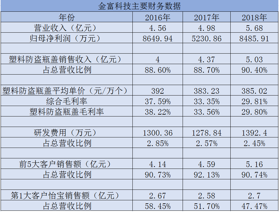 经过多年发展,金富科技业绩不断增长。招股书数据显示,2016年-2018年金富科技营业收入分别为4.56亿元、4.98亿元和5.68亿元。不过,从营收构成来看,金富科技业务较为单一,虽然其主要产品包括塑料防盗瓶盖、提手和其他产品,但近九成营收都是来自“塑料防盗瓶盖”。