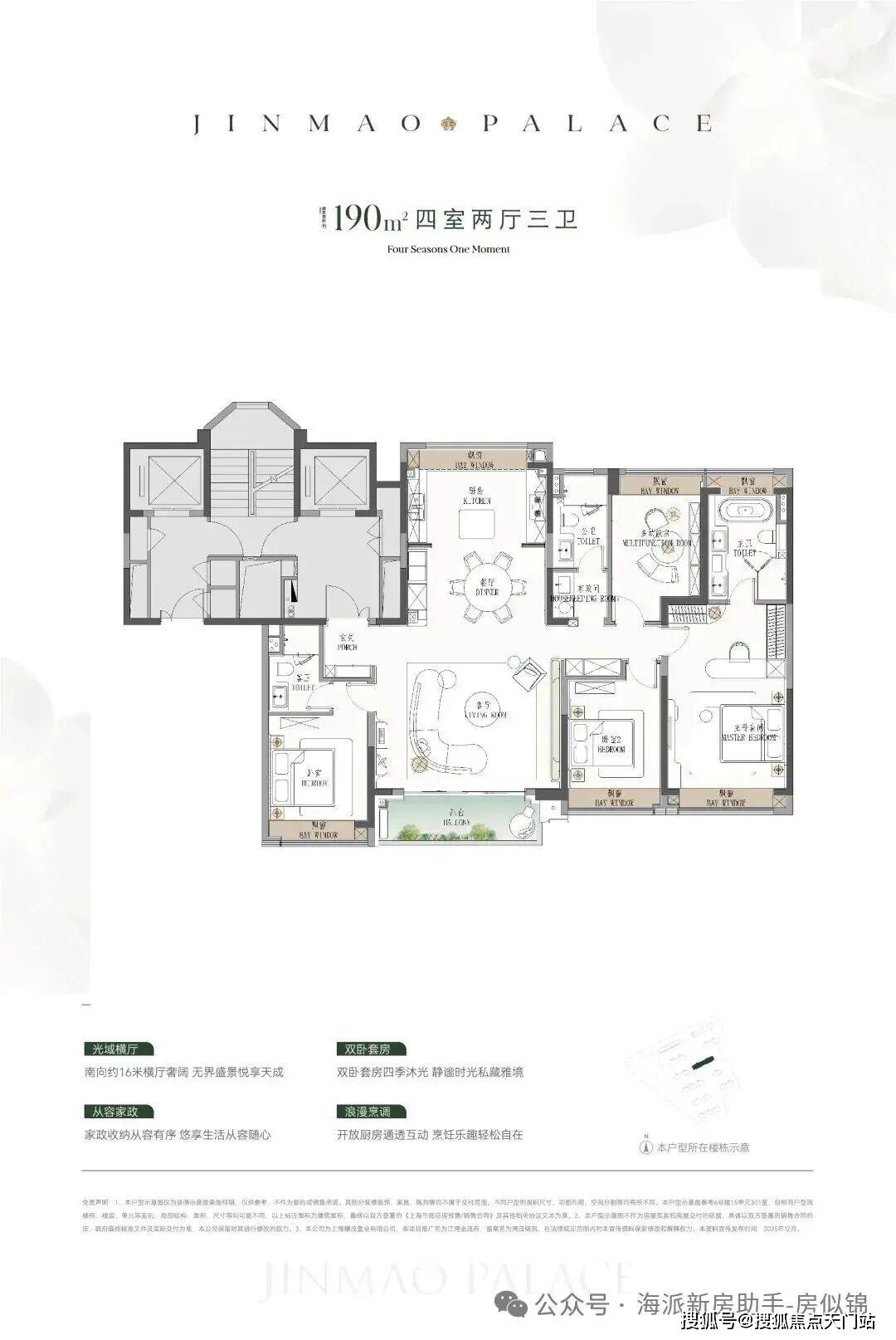 ● 建面约190㎡4房:楼王位置的顶奢大平层,同价位段在杨浦只能买到约120㎡3房!